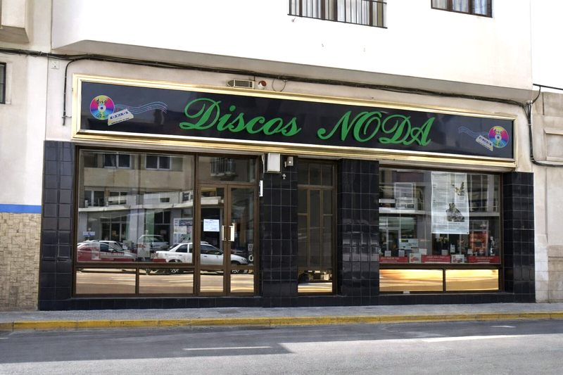 Rótulo luminoso de la tienda Discos Noda en la Avenida de Canarias de Vecindario, histórica cadena de establecimientos y referente de la comercialización musical en Canarias entre finales del siglo XX y comienzos del XXI, asociado al auge del cassette, del vinilo y posteriormente del CD. Fundada por <strong>Juan Ramón Santana Noda</strong>, llegó a convertirse en una de las mayores redes de tiendas de música del Archipiélago.