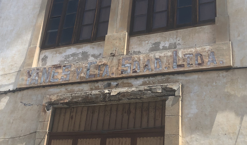 <!-- wp:paragraph --><p>Rótulo pintado sobre soporte de cemento en el antiguo almacén platanero de Yanes y Cía., situado frente al puerto de Tazacorte. La empresa <strong>Yanes y Cía. Sdad. Ltda.</strong> participó activamente en la economía local a través de la exportación de plátanos, tomates, almendras y cochinilla. El edificio donde se encuentra es un destacado ejemplo de arquitectura industrial vinculada a la exportación agrícola.<br><br>Un informe del doctor en Historia del Arte y profesor de la Universidad de La Laguna <strong>Jesús Pérez Morera</strong>, miembro además de las comisiones de Patrimonio Histórico de La Palma y Tenerife, destaca el especial interés cultural e importante valor histórico y ambiental de la infraestructura, que atesora recuerdos ya no solo relevantes para la Isla Bonita o Canarias, sino “de la historia universal”. Impulsado por ese informe, el inmueble fue declarado BIC (Bien de Interés Cultural) en el año 2023 y se desarrolló un proyecto para su rehabilitación. Nada se sabe desde entonces. El edificio sigue deteriorándose en junio de 2025. </p><!-- /wp:paragraph --><!-- wp:details --><details class="wp-block-details"><summary>Contexto histórico</summary><!-- wp:paragraph {"placeholder":"Teclea / para añadir un bloque oculto"} --><p><br>Con el despegue del ciclo platanero, el puerto de Tazacorte llegó a ser el cuarto en movimiento comercial en Canarias a finales del siglo XIX. Declarado de interés general en 1896, en 1926 se embarcaban en él más de 600.000 bultos de plátanos, tomates, almendras y cochinilla. Para la exportación de estos productos, don <strong>Armando Yanes Carrillo</strong>, nieto del reconocido comerciante <strong><a href="http://localhost/wordpress/inmemoriam/yanes/" data-type="inmemoriam" data-id="12690">Juan Yanes García</a></strong>, construyó en 1925 un gran almacén. Años más tarde, en 1941, construyó en un solar adyacente, frente al antiguo castillo de San Miguel, un trapiche de caña y alambique para destilar alcohol, cuya chimenea todavía se conserva. Son las únicas edificaciones que persisten de la antigua economía de la isla en esta zona.<br><br><strong>Armando Yanes</strong> combinó la tradición familiar mercantil con una intensa vida pública y cultural. Nacido en Santa Cruz de La Palma en 1884, tuvo un relevante papel como comerciante y empresario. Gran aficionado a los deportes náuticos, se dedicó a la construcción naval y viajó en su goleta <em>Benahoare</em>, el último velero construido en la isla, por todas las islas Canarias. A él se debe la construcción del <em>Barco de la Virgen</em>, réplica de la nao <em>Santa María</em> de Cristóbal Colón, convertido en museo naval y de gran importancia en las <em>Bajadas Lustrales de la Virgen de Las Nieves</em>. Escribió el libro <em>Cosas viejas de la mar</em> y otros trabajos como <em>La red hidráulica</em>, una compilación de artículos sobre la red de aguas. En 1924 llegó a presidir el Cabildo Insular de La Palma. Falleció en 1965.</p><!-- /wp:paragraph --></details><!-- /wp:details -->
