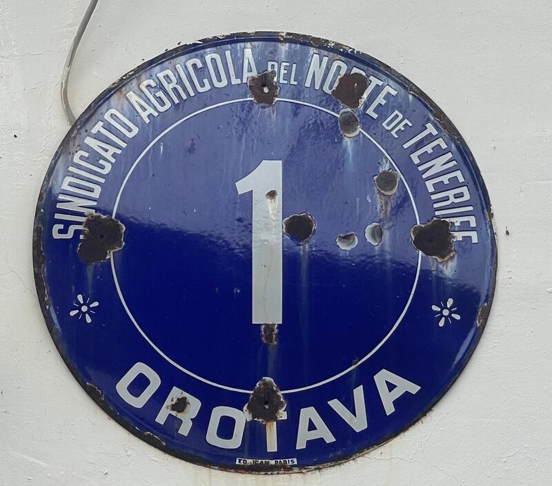 <!-- wp:paragraph --><p>Placa metálica en la finca El Patio, en El Guincho, Tenerife, una de las más antiguas y emblemáticas del cultivo del plátano en Canarias. La finca, con más de 400 años de historia, es un importante testimonio del desarrollo agrícola en Tenerife. Servía para identificar la finca dentro de la red del <strong>Sindicato Agrícola del Norte de Tenerife</strong>, fundado el 1 de diciembre de 1914 por 23 agricultores del Valle de La Orotava para defender los intereses de los productores locales y romper el monopolio británico en la producción y exportación, que predominaba en aquella época. Esta iniciativa marcó el inicio de las cooperativas plataneras en Canarias. En 1937 se creó la <strong>Federación Agrícola de Sindicatos de Tenerife (FAST)</strong>, integrada por socios de diversas entidades, incluyendo el Sindicato Agrícola del Norte de Tenerife. En 1946 el SANT colaboró en la formación de la primera cooperativa agrícola junto a la Unión de Cosecheros y la FAST, consolidando así la cooperación entre agricultores de la región.<br><br>El origen de la Finca se remonta al siglo XV, cuando la familia <strong>Ponte</strong>, de origen italiano, comenzó su desarrollo. Situada sobre una antigua colada de lava, abarca más de 60 hectáreas dedicadas principalmente al cultivo de plátanos, ha sido testigo de la evolución agrícola de Tenerife y ha mantenido su actividad a lo largo de los siglos. Actualmente, además de su función agrícola, la Finca El Patio ofrece servicios de hospedaje rural.</p><!-- /wp:paragraph -->