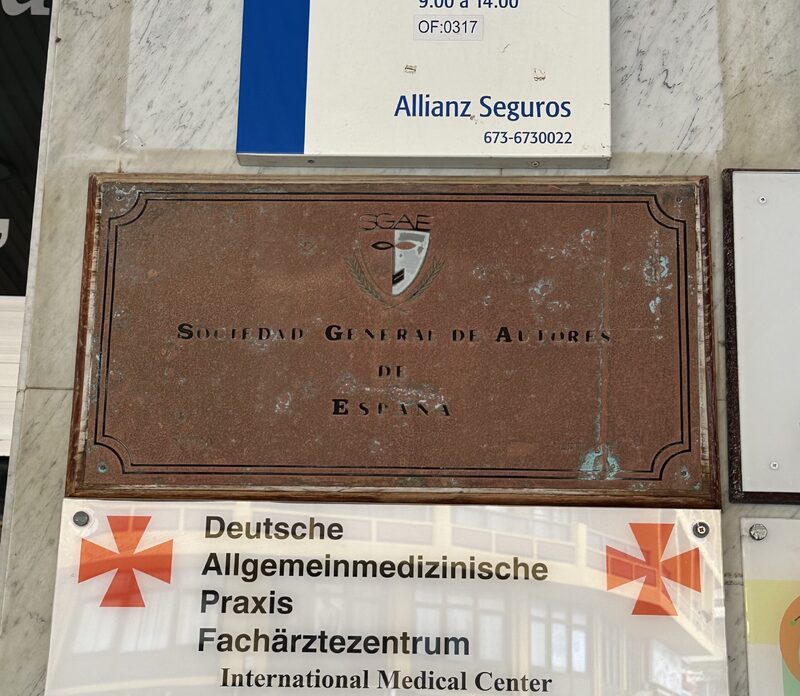 <!-- wp:paragraph --><p>Placa institucional de la SGAE en metal esmaltado, instalada en un edificio céntrico del Puerto de la Cruz, vinculada a la presencia activa de esta entidad en la ciudad durante las décadas de mayor efervescencia musical y cultural. El diseño incluye el antiguo logotipo de la institución, el emblema clásico con la máscara teatral, propia del periodo previo a la reforma de identidad de 1995, año en que la SGAE pasó a denominarse “Sociedad General de Autores y Editores”, momento en que también cambió su logotipo y líneas gráficas. Este rótulo veterano constituye un testimonio gráfico y documental de la infraestructura cultural activa en la ciudad.</p><!-- /wp:paragraph -->